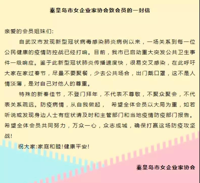 當前,新型冠狀病毒感染肺炎疫情的防控工作牽動著全國人民的心,秦皇島市女企業家協會積極響應市委、市政府的組織號召,在市婦聯的支持下,勇于擔當、積極行動,為打贏這場疫情防控抗擊戰貢獻女企業家力量。