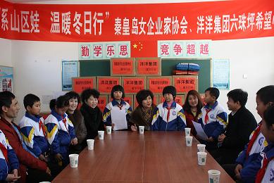 2013年12月9日洋洋集團攜手市女企業家協會開展了“情系山區娃 溫暖冬日行”活動。洋洋集團聯合市女企業家及洋洋集團商戶向青龍六珠坪洋洋希望小學的孩子們捐贈了150多套棉服,給孩子們帶去了冬天的溫暖,也帶去了洋洋人對孩子們深切的問候!
