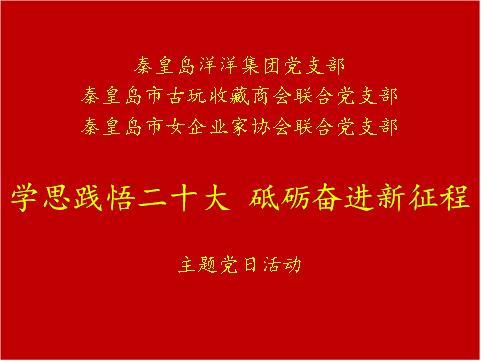 秦皇島洋洋集團黨支部、秦皇島市古玩收藏商會聯(lián)合黨支部、秦皇島市女企業(yè)家協(xié)會聯(lián)合黨支部組織黨員和入黨積極分子于2022年10月21日上午10點,在秦皇島洋洋集團四樓會議室開展“學思踐悟二十大、砥礪奮進新征程”主題黨日活動。