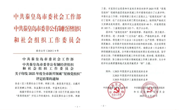 6月27日,秦皇島市委社會(huì)工作部、兩新工委印發(fā)了《2025年度全市新興領(lǐng)域“星級(jí)黨組織”評(píng)定結(jié)果的通知》(秦非公字【2025】9號(hào)),秦皇島洋洋集團(tuán)黨支部、秦皇島市古玩收藏商會(huì)黨支部、秦皇島市園林綠化工程施工商會(huì)黨支部、秦皇島市女企業(yè)家協(xié)會(huì)聯(lián)合黨支部憑借扎實(shí)的黨建工作、突出的先鋒模范作用及優(yōu)異的工作成效,獲評(píng)“四星級(jí)黨組織”榮譽(yù)稱(chēng)號(hào)。