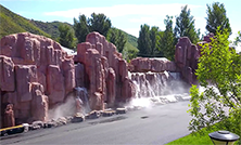 假山瀑布景觀,通過假山、瀑布、霧化裝置、彩色射燈等科學(xué)布置打造的超大型山水瀑布景觀群,是游客進(jìn)行拍照留念的打卡點。