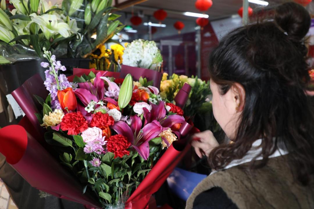 元宵節前后兩天,鮮花銷量明顯增長。為了更好地滿足顧客的需求,從嬌艷的玫瑰、浪漫的百合,到寓意吉祥的蝴蝶蘭、富貴竹,商戶準備的貨品應有盡有。這其中,玫瑰是絕對的“主角”,經典的紅玫瑰、復古色調的‘卡布奇諾’和清新甜美的‘蜜桃雪山’等在市場里都能看到,商戶都在忙著制作花束。