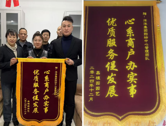 冬至已過,寒意漸濃,而秦皇島市洋洋花卉購物中心內卻暖意洋洋。12月26日,在一片溫馨的氛圍中,鑫植園園藝經營商家滿懷感激地來到商場辦公室,鄭重地送上一面錦旗,其上“優質服務促發展、心系商戶辦實事”的字樣熠熠生輝。這面錦旗,不僅是對商場工作的高度贊譽,更是一份承載著商戶信任的沉甸甸責任。