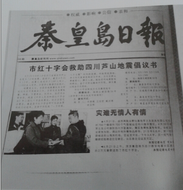 秦皇島洋洋集團,熱心公益事業(yè),時刻關注社會民生,在2013年汶川地震之際,第一個向災區(qū)伸出援助的雙手,向我市紅字會送去善款,用于雅安災后重建。