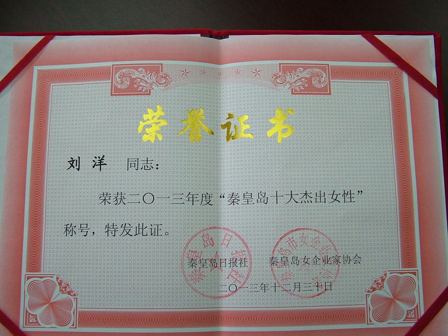 秦皇島洋洋集團(tuán)總裁劉洋榮獲“2013年度秦皇島十