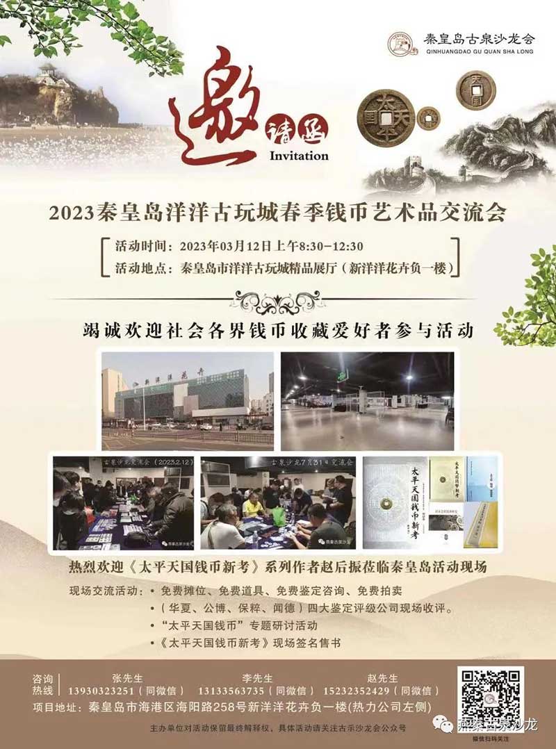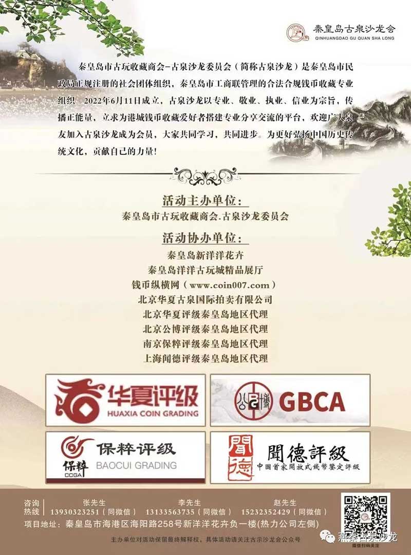 秦皇島古玩收藏商會——古泉沙龍委員會(簡稱古泉沙龍)是經(jīng)秦皇島市民政局注冊,接受市工商聯(lián)管理的正規(guī)錢幣收藏組織,于2022年6月11日正式成立。古泉沙龍以專業(yè),敬業(yè),執(zhí)業(yè),信業(yè)為宗旨,力求為港城錢幣愛好者搭建分享交流的平臺。