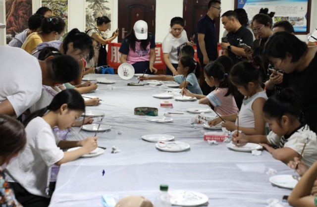 秦皇島市古玩收藏商會書畫專業委員會的資深書法家為孩子們介紹了展區內的文玩瓷器及瓷器的發展歷史,讓大家能夠近距離感受到傳統文化的魅力。隨后,在書法家的指導下孩子們紛紛開始瓷器彩繪體驗,他們揮動著手中的畫筆,丹青描繪,妙筆生花。一個個普普通通的白色陶器,經過孩子們富有想象力的勾勒和填色,變成了五彩斑斕、獨一無二的作品。