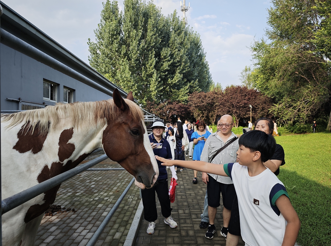 河北英皇(國際)馬術俱樂部以馬文化為主題,搭建國際化“馬術”互通平臺,商家們在園區工作人員的帶領下,走進專業化的室內賽馬場及馬廄,觀賞了馬術表演,并與馬兒親密互動。