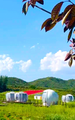 獨具特色的星空玻璃球酒店,游客們可以在星空帳篷內觀賞周圍景色和絢麗星空。每一個星空酒店還搭 配著燈光地臺,能讓外部成為一一個小露臺,享受戶外悠閑愜意的生活。玻璃房上三角形的窗戶,可電 動控制開合, 晚上可以觀星賞月,室內各項基礎設施完備,注重游客私密性、舒適性。